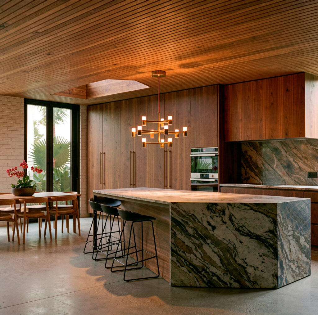 A palette of white brick and warm cedar establishes a sense of calm permanence, while a finely detailed cedar screen wraps the façade like a piece of folded timber origami. This motif becomes the project’s guiding language, carried beyond the exterior and woven through the architecture itself. Subtle shifts in the floor plan echo the idea of folding and unfolding, creating moments of compression and release, while bespoke cabinetry continues the theme with crisp lines and faceted surfaces.
